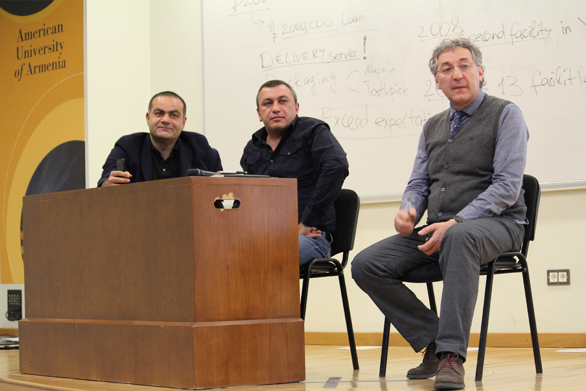 <p>December 8, 2016. The owners of national food chain KARAS Tigran Yuzbashyan and Ashot Harutyunyan held a meeting with the students of the American University of Armenia (AUA) and presented the concept of Karas’ brand, told about the history of Karas’ foundation, as well as the difficulties on their way and the overcoming of the last. As a result of the meeting, we can surely say that the topic of the discussion was “How to become a winner in the market and stay a leader for more than 11 years.”<br>During an interactive discussion that lasted more than two hours, the students got an opportunity to learn about the interesting way of Karas, the structure of their corporate governing and cooperation with “European Bank of Reconstruction and Development.” In the beginning of the meeting, it was announced that the authors of the hardest and the most interesting questions will be presented with Karas gift cards and every student put their effort to become a winner. The questions regarded Karas having the biggest delivery system in the market, healthy competition, leadership skills, as well as, how difficult or easy it is to work together being childhood friend. To this question, T. Yuzbashyan asnswered that that there's only one thing they cannot share with A. Harutyunyan and that is a lighter.<br>The work of Karas' leadership is a bright example of how working hard can help one achieve heights and hold their position of a leader, thus becoming a great motivation for the youth. </p><p> </p><p> </p>