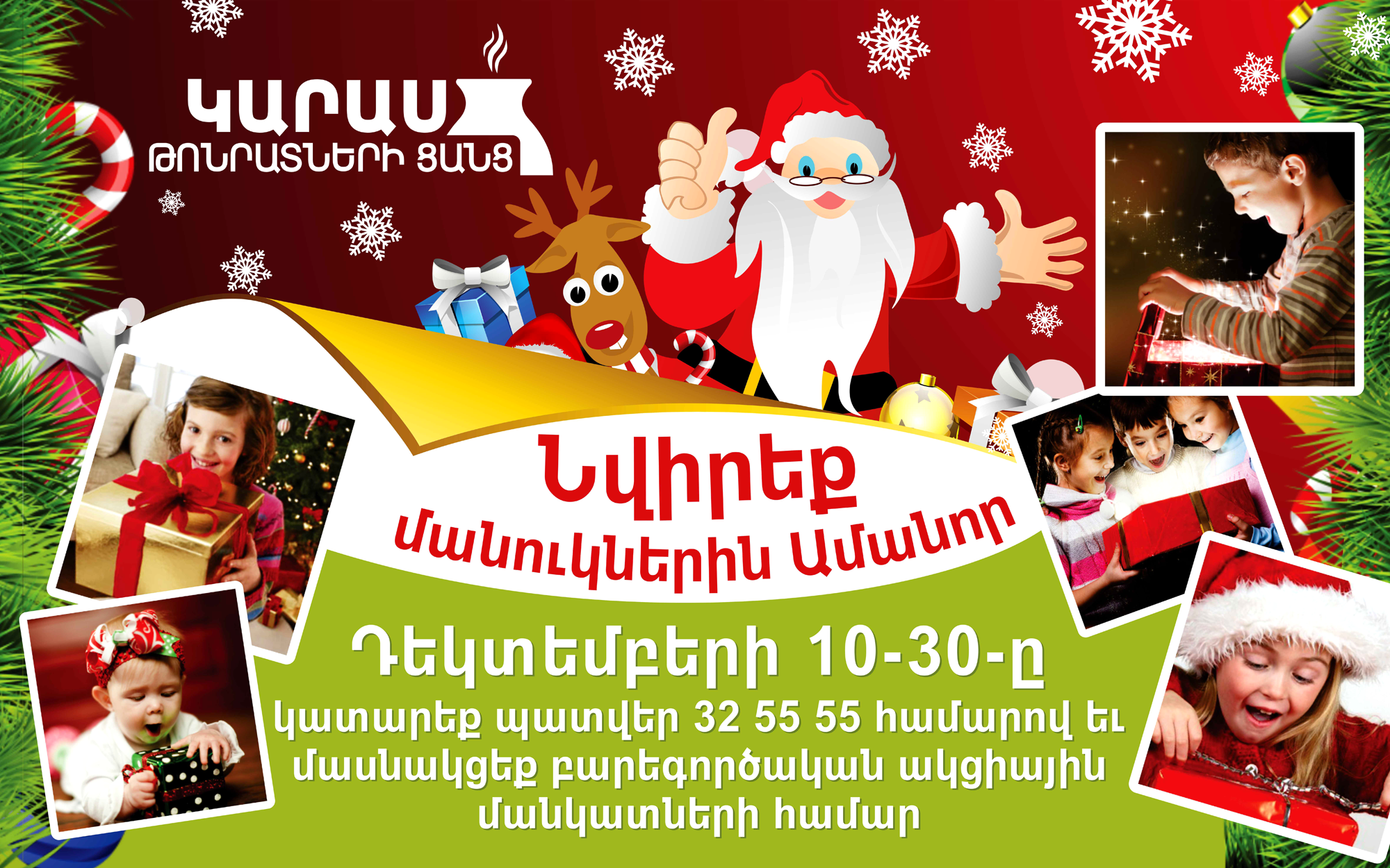 <p><strong>10 դեկտեմբերի 2012թ. Կարաս ընկերությունը մեկնարկել է «Նվիրենք մանուկներին Ամանոր» բարեգործական ակցիան.</strong></p><p>Բարեգործական ակցիան կազմակերպված է Երևան քաղաքի մանկատների համար և&nbsp; կտևի մինչև դեկտեմբերի 30–ը: Ընկերության յուրաքանչյուր հաճախորդ կարող է մասնակցել ակցիային` դեկտեմբեր ամսին այցելելով Կարաս սննդի սպասարկման կետերից մեկը կամ կատարելով առաքման պատվեր 32-55-55 հեռախոսահամարով: Հաճախորդների կողմից կատարված գնումների մի մասը կհամալրի բարեգործական ակցիայի բյուջեն:</p><p>Հավաքված գումարով Երևանի մանկատներում կպատրաստվեն տոնական սեղաններ և կկազմակերպվեն ամանորյա ներկայացումներ, որտեղ 162 երեխաներ կստանան ամանորյա նվերներ:</p><p>«Ամանորին բոլոր փոքրիկները երազում են հրաշքների մասին, իսկ ծնողազուրկ երեխաների համար սա առավել սպասված ժամանակ է: Նրանք կարիք ունեն ուշադրության, ջերմության և իհարկե, խաղալիքների ու իրական տոնական ճաշկերույթի: Մենք ցանկանում ենք այս մանուկներին նվիրել Ամանոր և մեր հաճախորդներին հնարավորություն ենք ընձեռում միանալ միջոցառմանը»»&nbsp;- նշեց Կարասի հիմնադիրներից Տիգրան Յուզբաշյանը:</p><p><strong>&nbsp;<img alt="" src="https://www.karas.am/storage/images/samokley_vardananc.png" style="height:325px; width:520px"></strong></p>
