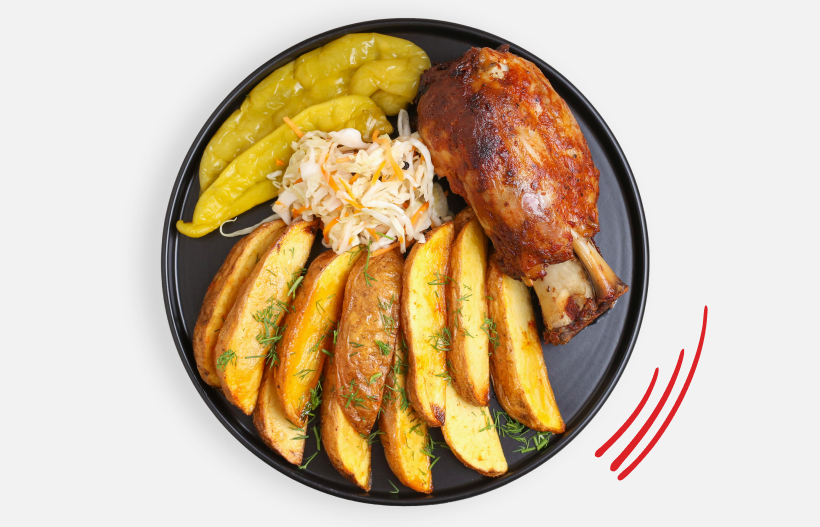 Бедро местной свинины 48-часовой выдержки в коньячном соусе. Подается с деревенским картофелем, острым чесночным соусом